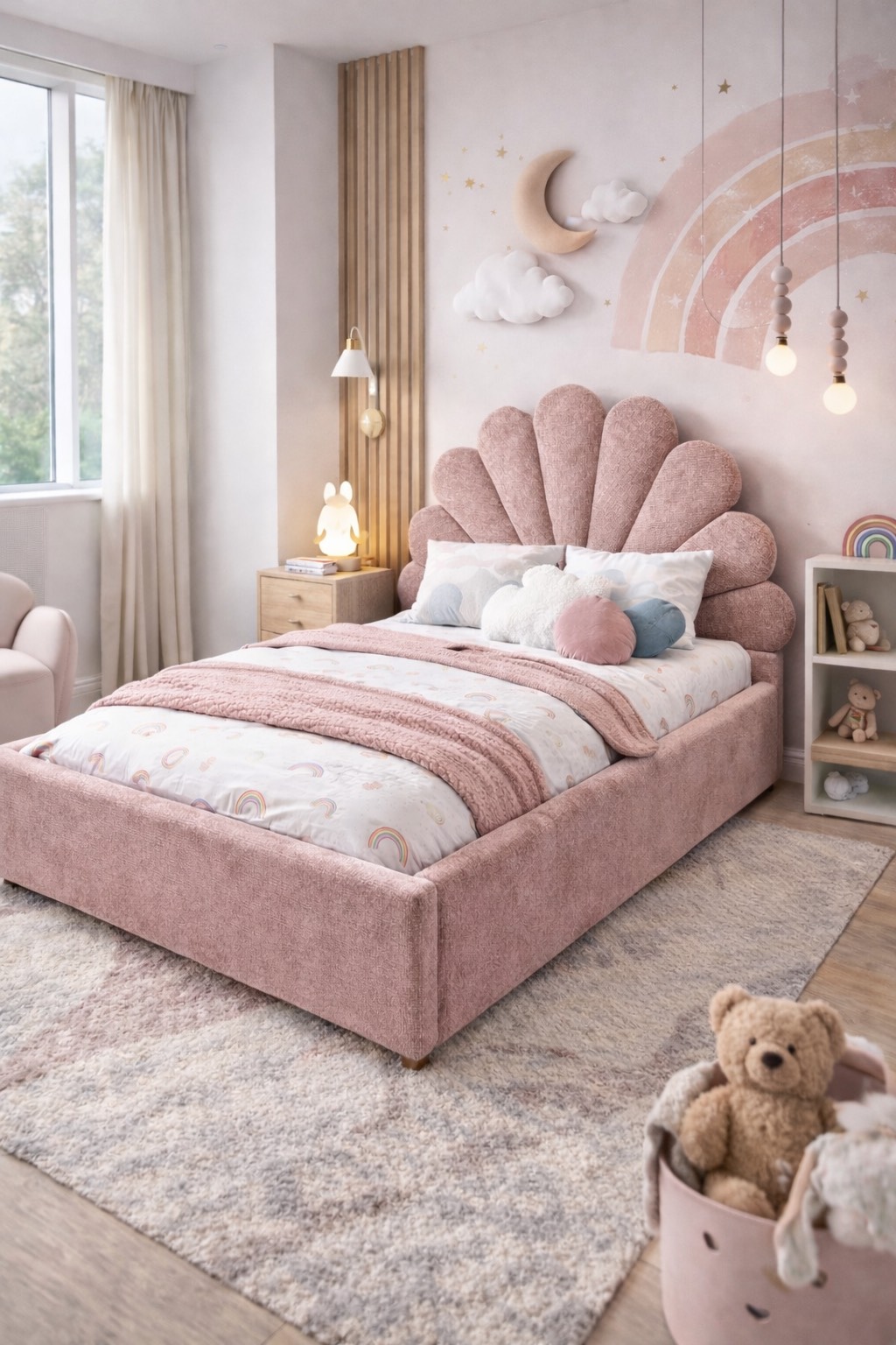 Детски кревет SHELL – Овој детски кревет во розев букле микрофибер е совршен спој на удобност и магичен дизајн. Со меко тапацирана форма и нежен изглед, создава топол и бајковит амбиент во детската соба.