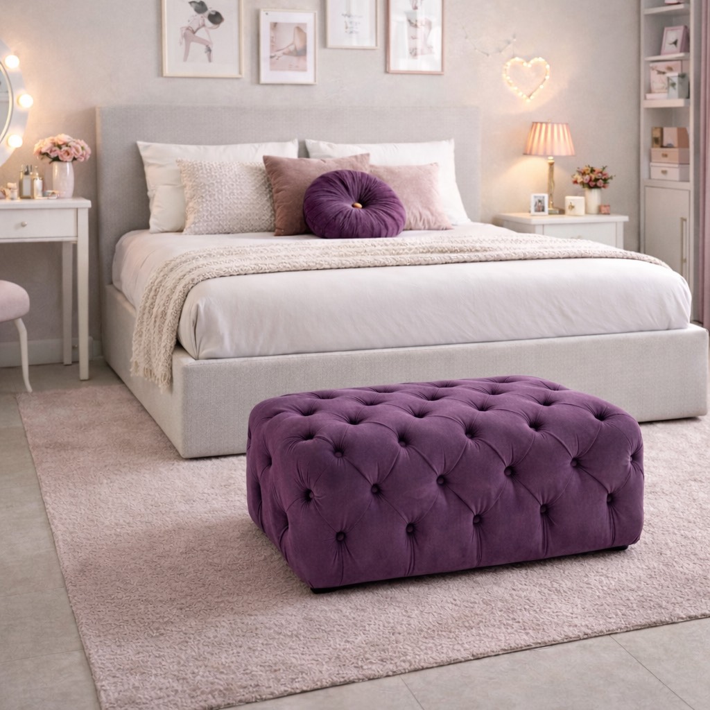 Декоративните копчиња и формата додаваат доза на луксуз и софистицираност, додека нејзината практичност овозможува да се користи како дополнително седење, продолжение на софата или стилски акцент во дневната соба.