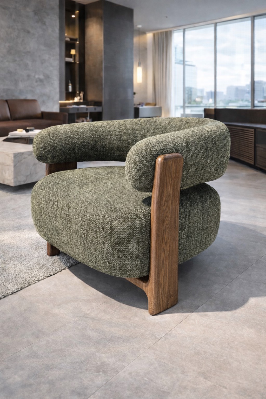 Дрвените ногарки од природно дрво додаваат топлина и стабилност, создавајќи совршен баланс помеѓу модерниот дизајн и природните елементи. Нејзината форма е дизајнирана за удобност – со удобно седиште и обвиткувачки линии кои овозможуваат вистинско опуштање.