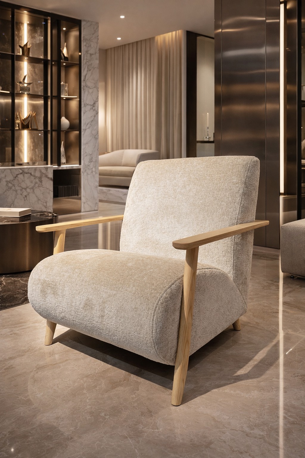 Ногарките од природно дрво додаваат топлина и стабилност, создавајќи совршен баланс помеѓу модерниот изглед и природните материјали. Крем нијансата овозможува лесно комбинирање со различни стилови на ентериер – од скандинавски до луксузно минималистички.
