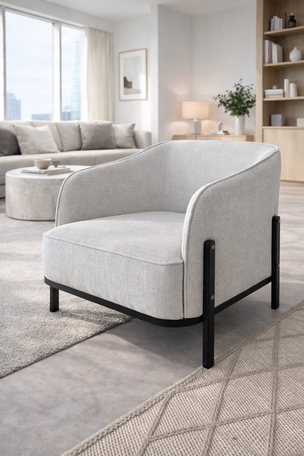 Нејзиниот дизајн е минималистички, но впечатлив, додека темните дрвени ногарки даваат модерен контраст и стабилност. Формата е создадена за опуштено седење, овозможувајќи чувство на релаксација и удобност во секој момент.